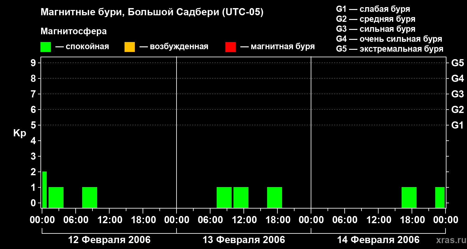 Изменения геомагнитного индекса Kp с 12 по 14 февраля 2006 года для средних широт