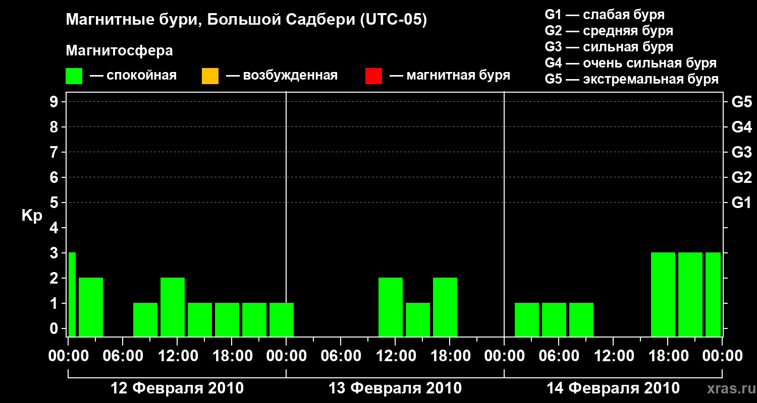 Изменения геомагнитного индекса Kp с 12 по 14 февраля 2010 года для средних широт