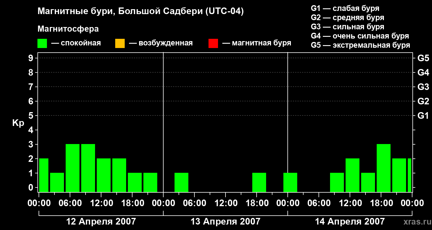 Изменения геомагнитного индекса Kp с 12 по 14 апреля 2007 года для средних широт