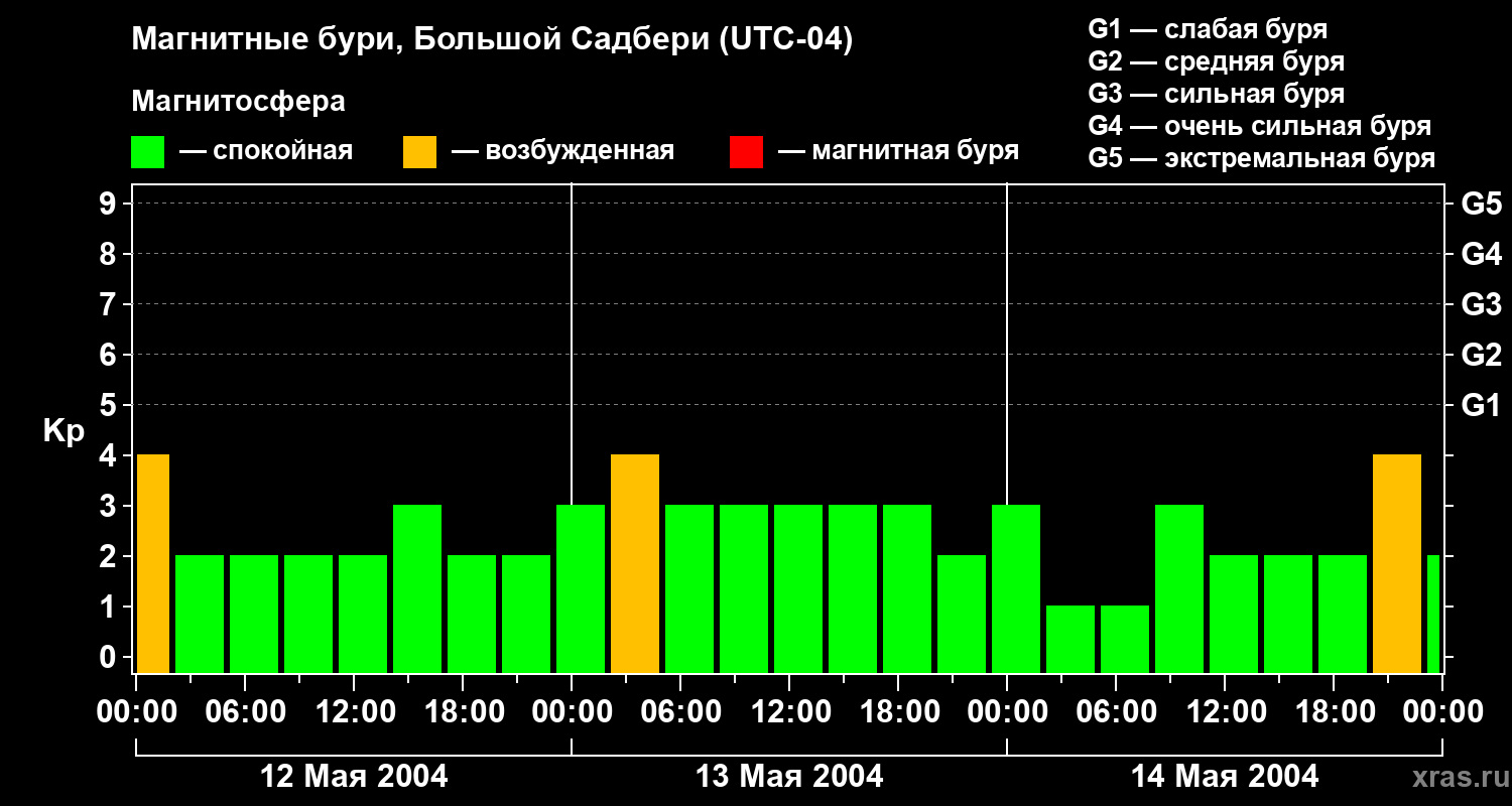 Изменения геомагнитного индекса Kp с 12 по 14 мая 2004 года для средних широт
