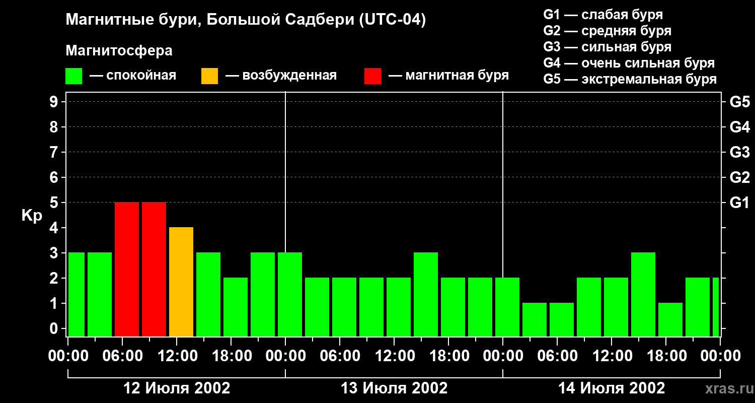 Изменения геомагнитного индекса Kp с 12 по 14 июля 2002 года для средних широт