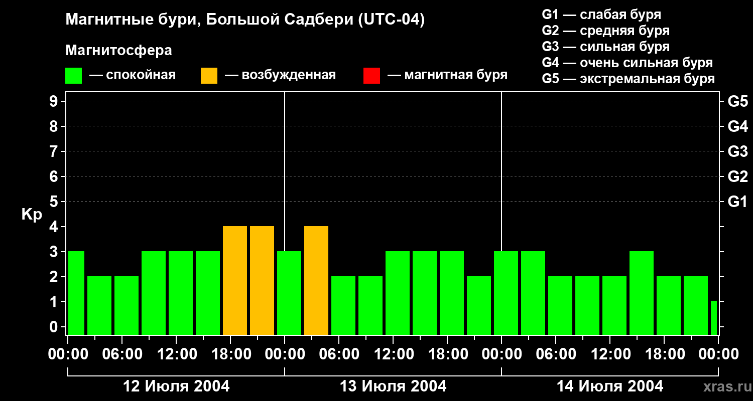 Изменения геомагнитного индекса Kp с 12 по 14 июля 2004 года для средних широт