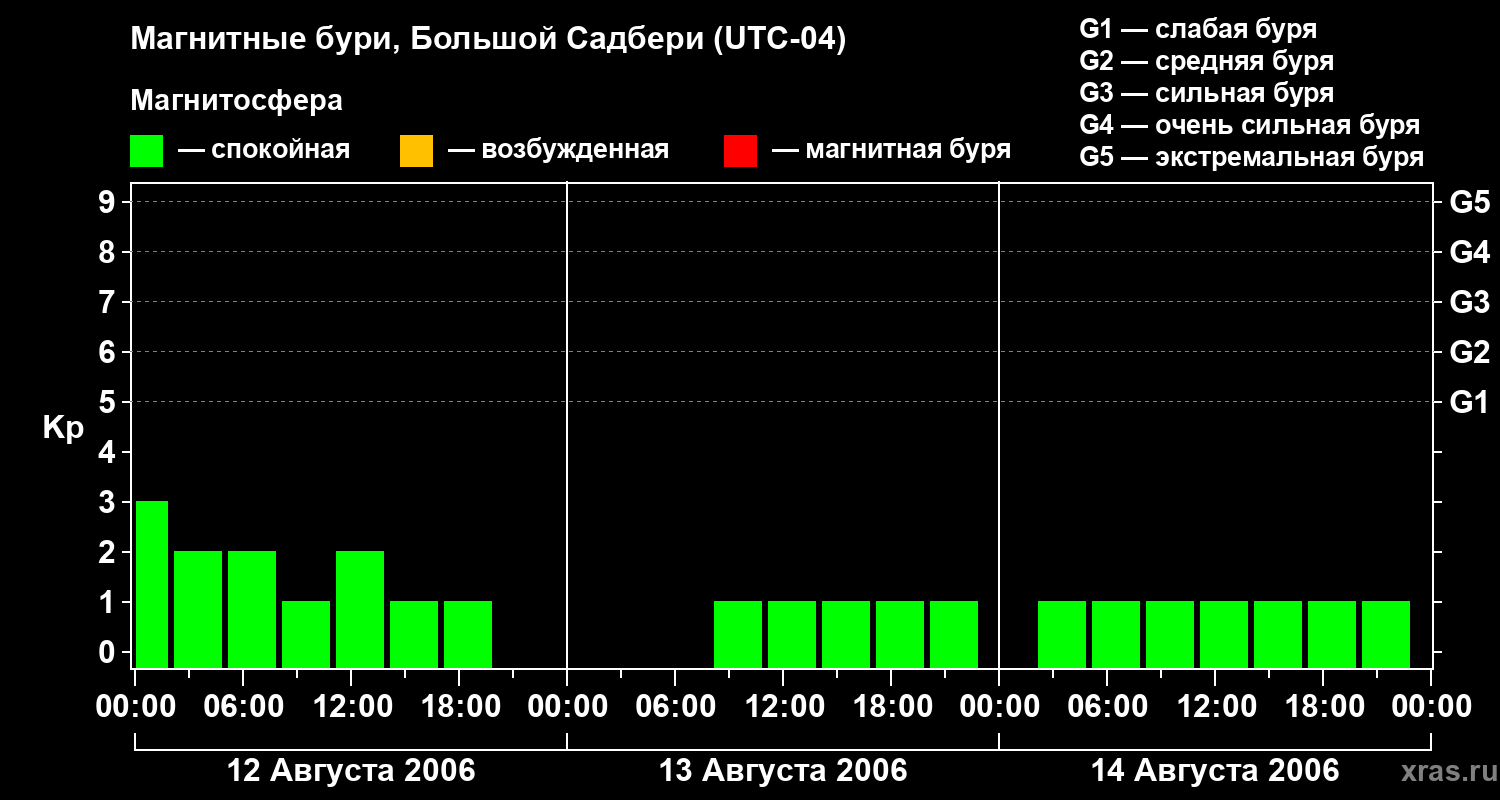 Изменения геомагнитного индекса Kp с 12 по 14 августа 2006 года для средних широт