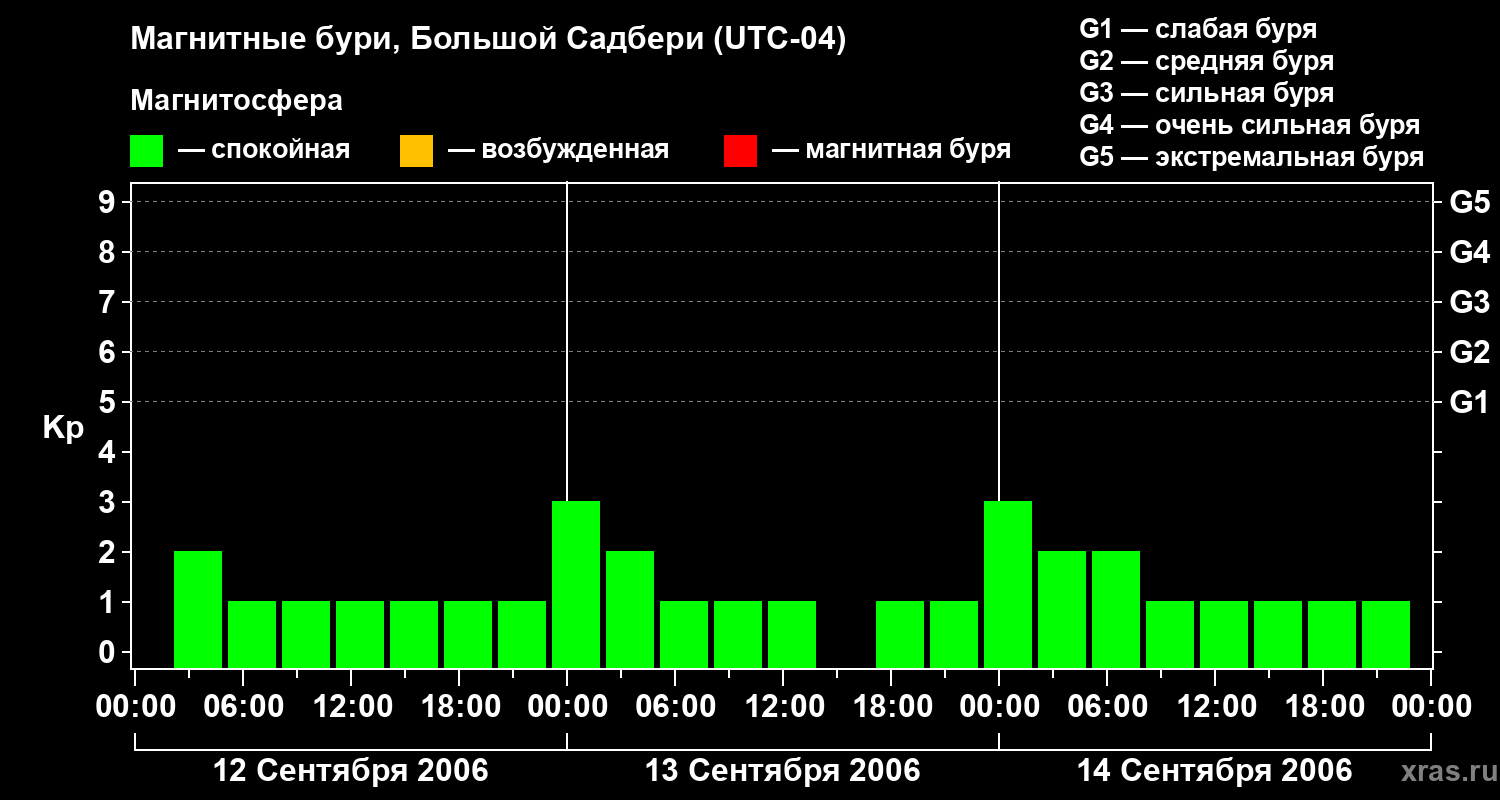 Изменения геомагнитного индекса Kp с 12 по 14 сентября 2006 года для средних широт