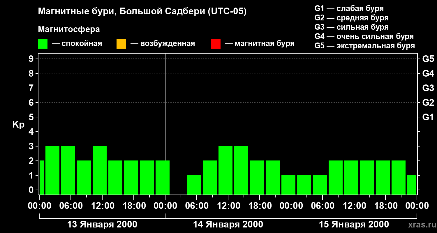 Изменения геомагнитного индекса Kp с 13 по 15 января 2000 года для средних широт