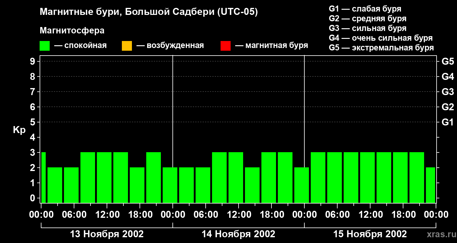 Изменения геомагнитного индекса Kp с 13 по 15 ноября 2002 года для средних широт
