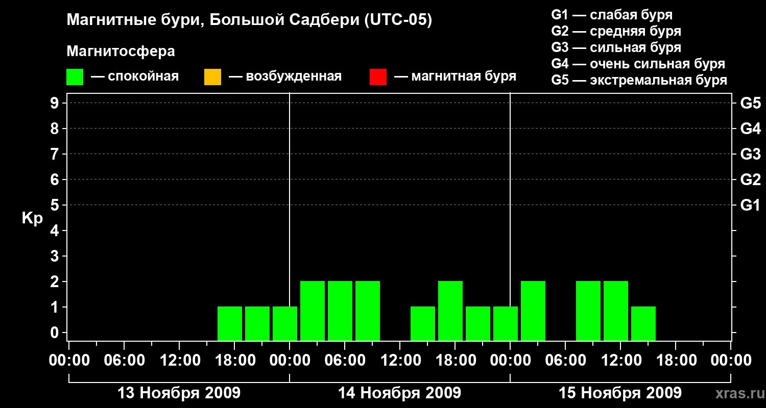 Изменения геомагнитного индекса Kp с 13 по 15 ноября 2009 года для средних широт
