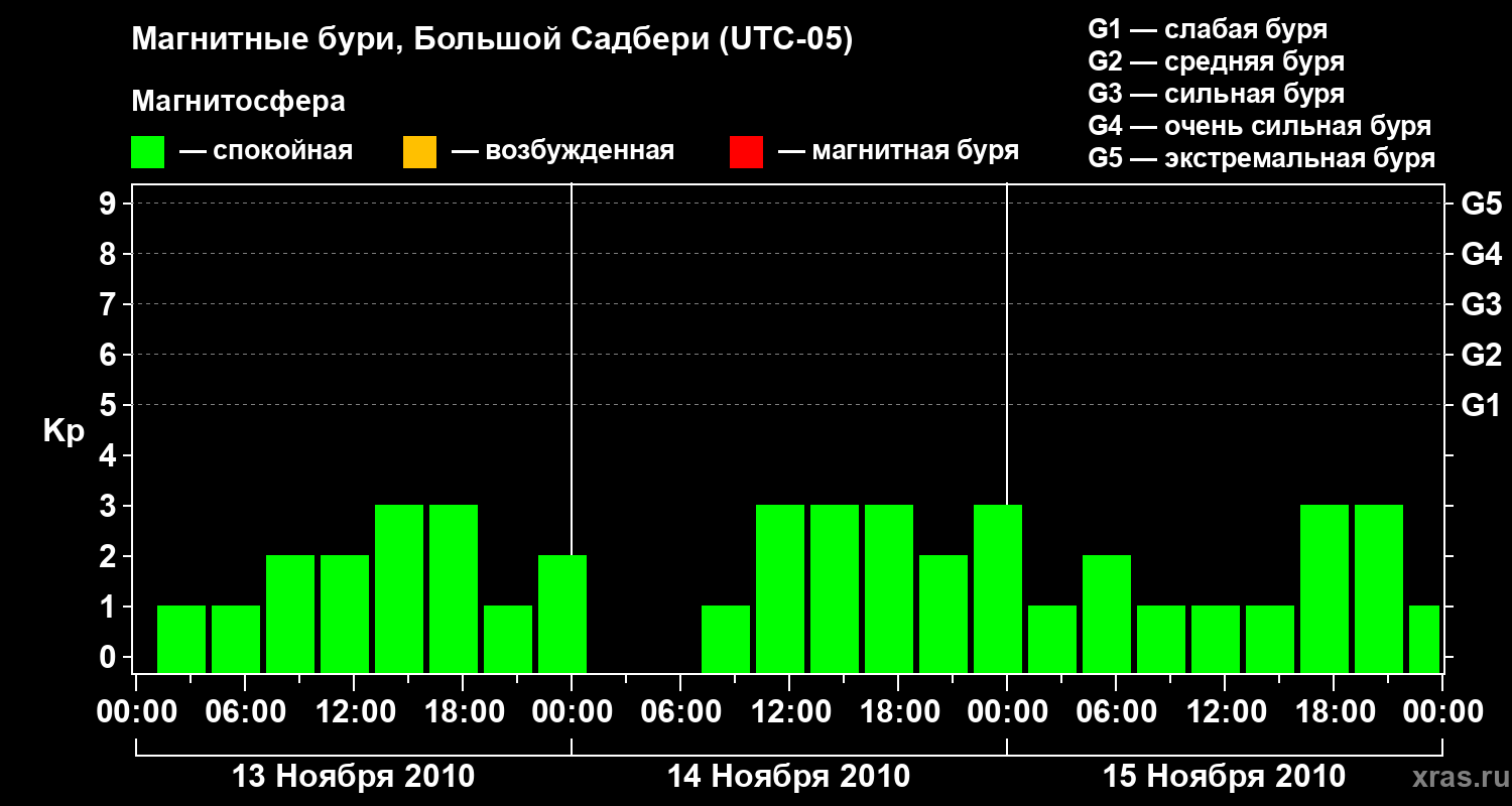 Изменения геомагнитного индекса Kp с 13 по 15 ноября 2010 года для средних широт