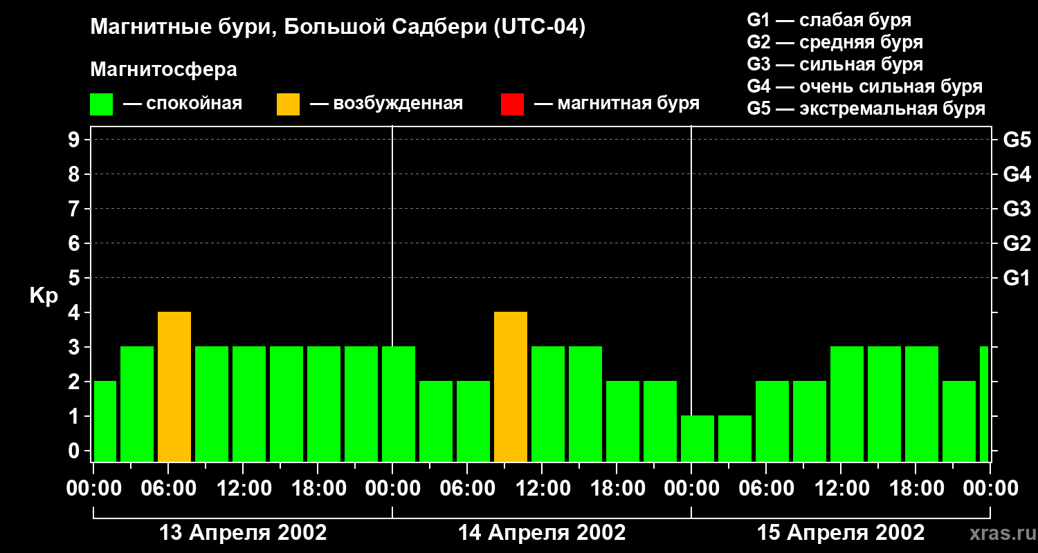 Изменения геомагнитного индекса Kp с 13 по 15 апреля 2002 года для средних широт