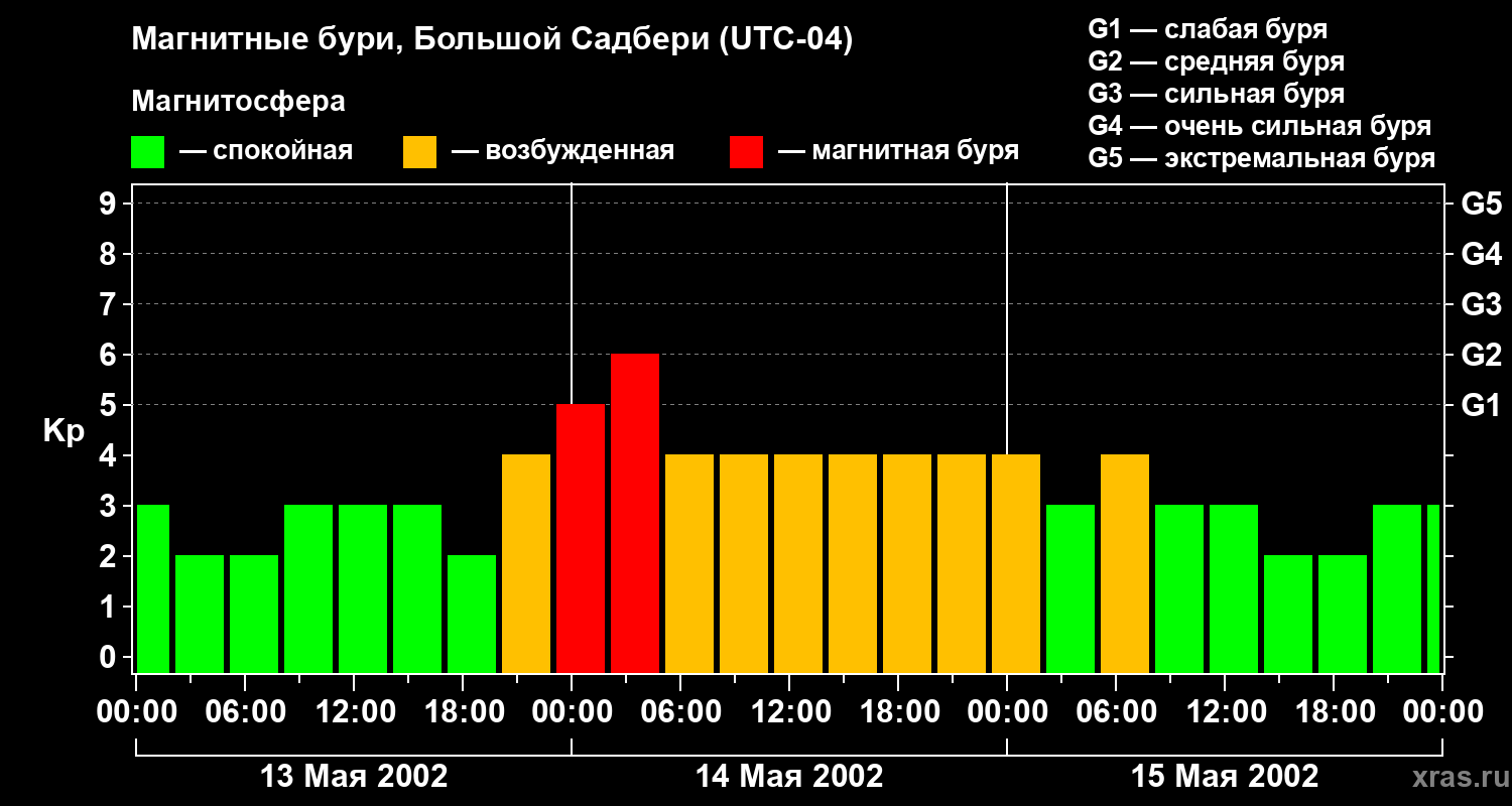 Изменения геомагнитного индекса Kp с 13 по 15 мая 2002 года для средних широт