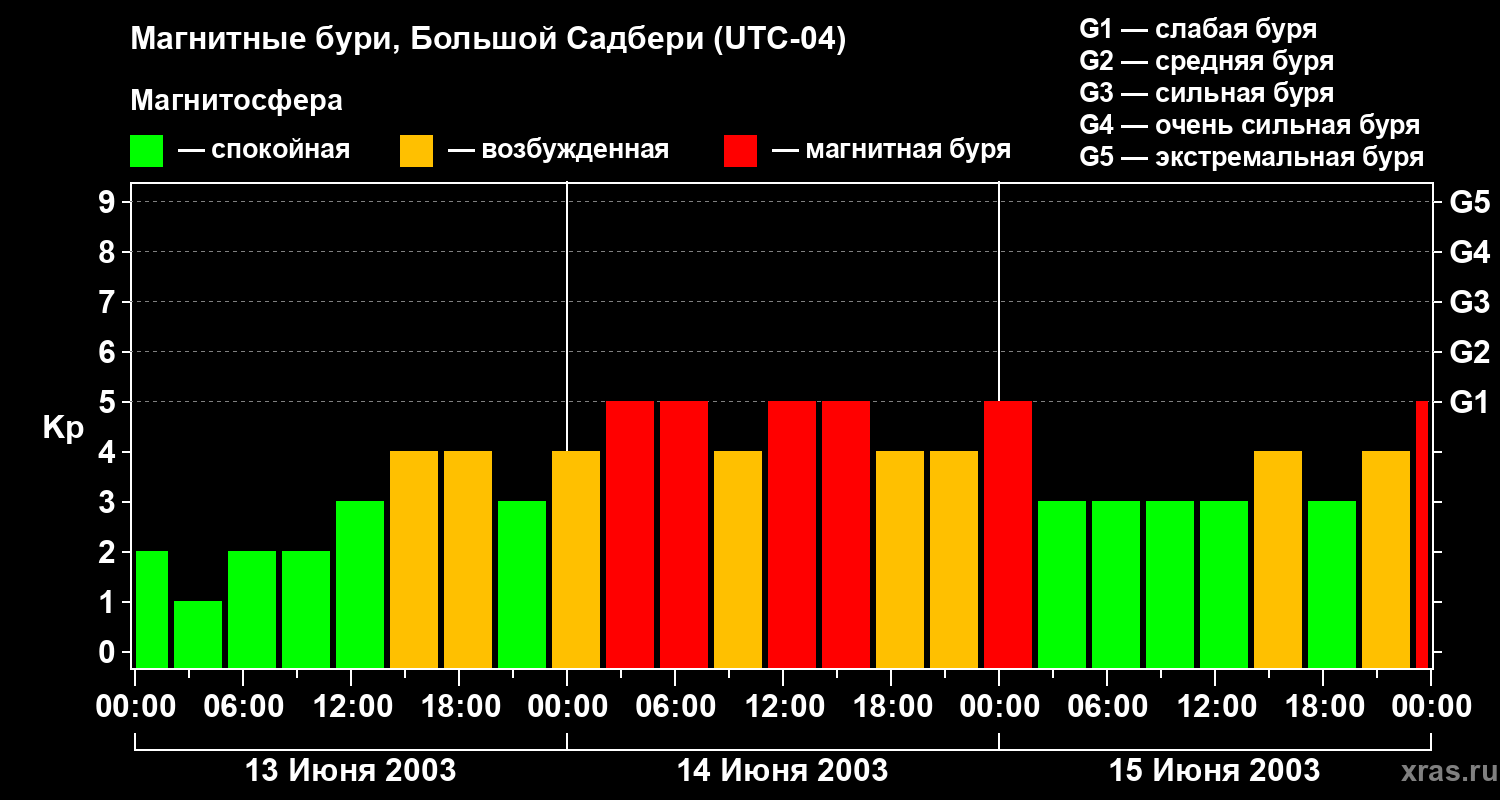 Изменения геомагнитного индекса Kp с 13 по 15 июня 2003 года для средних широт