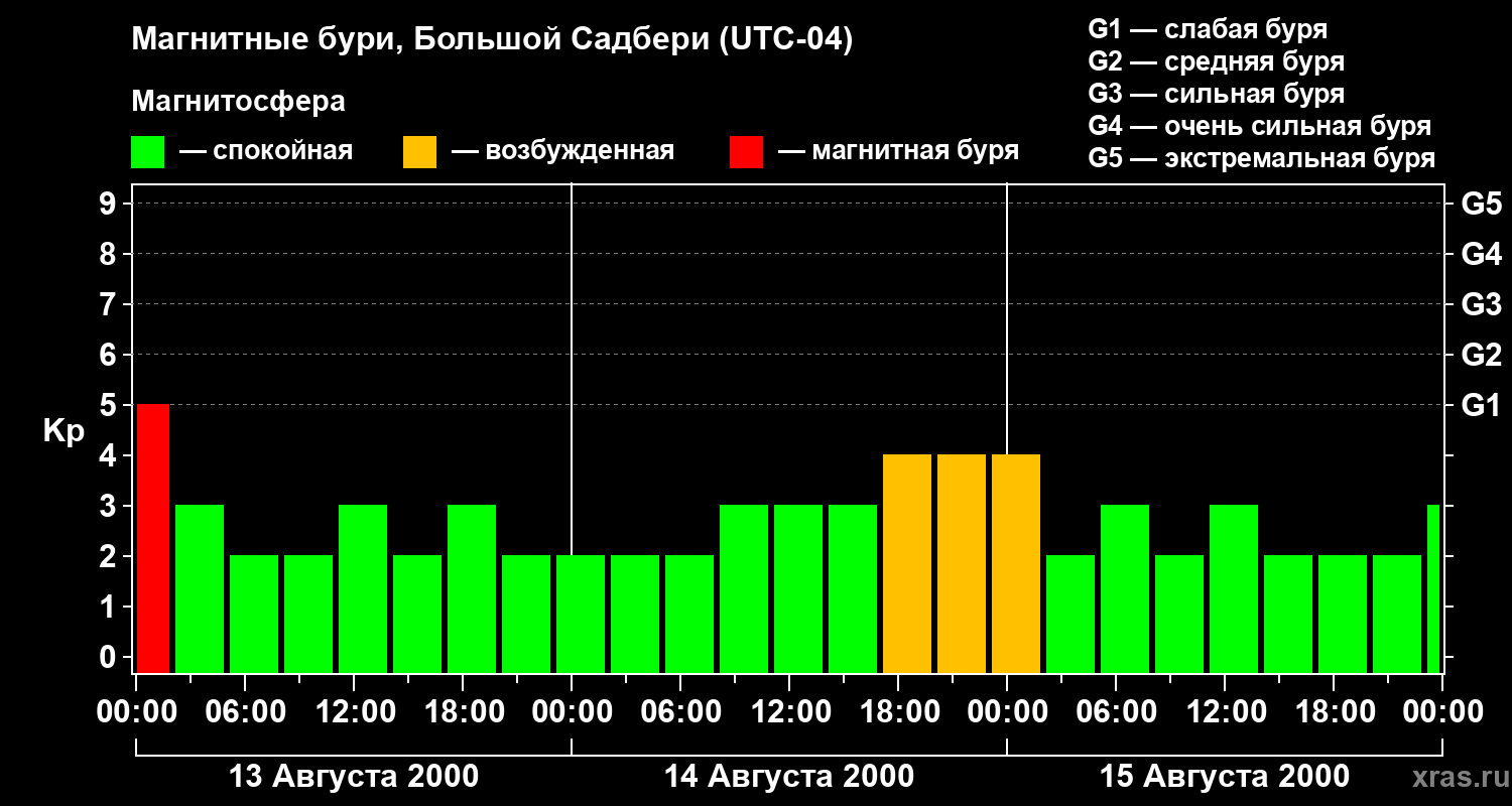 Изменения геомагнитного индекса Kp с 13 по 15 августа 2000 года для средних широт