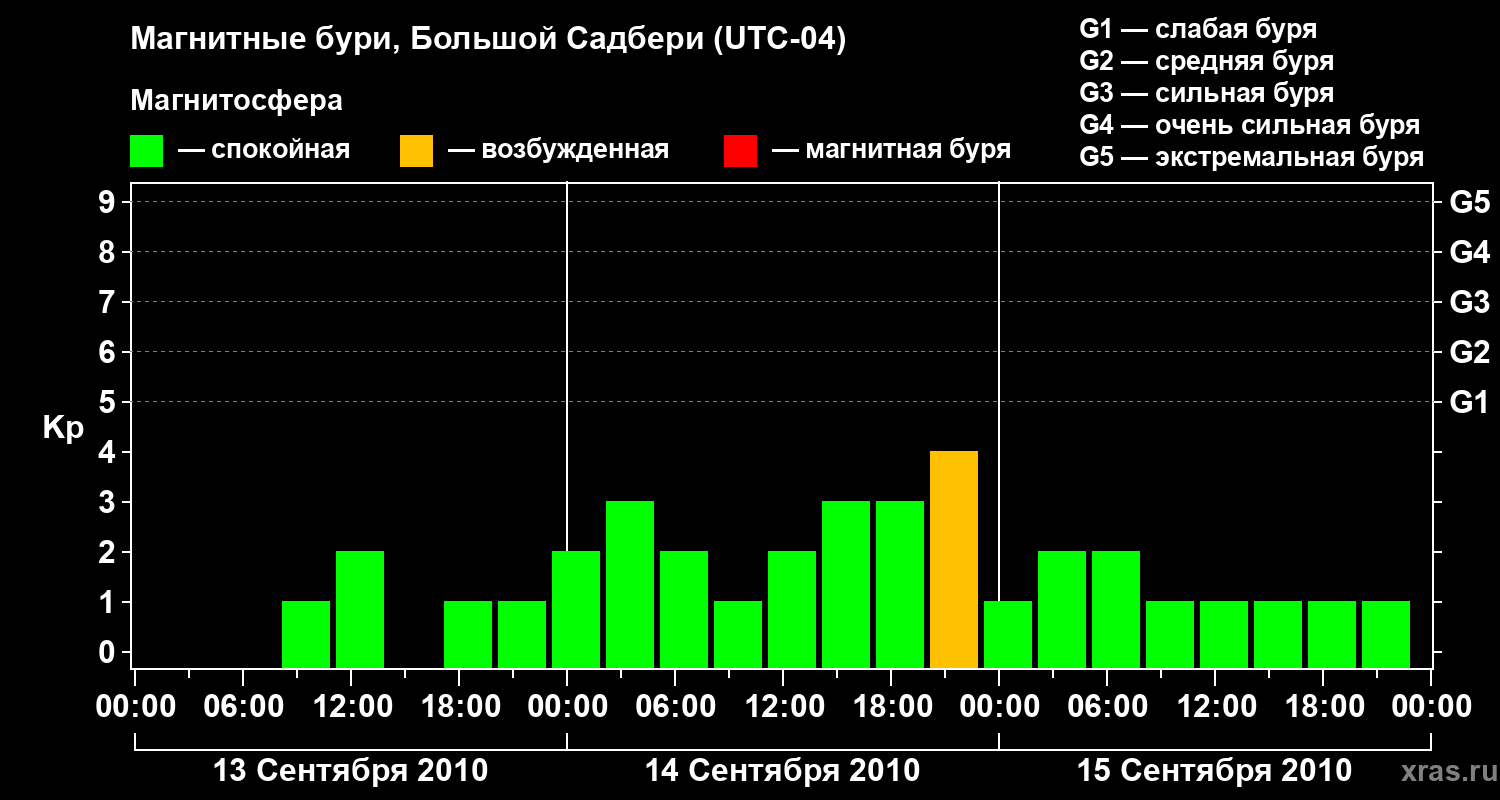 Изменения геомагнитного индекса Kp с 13 по 15 сентября 2010 года для средних широт