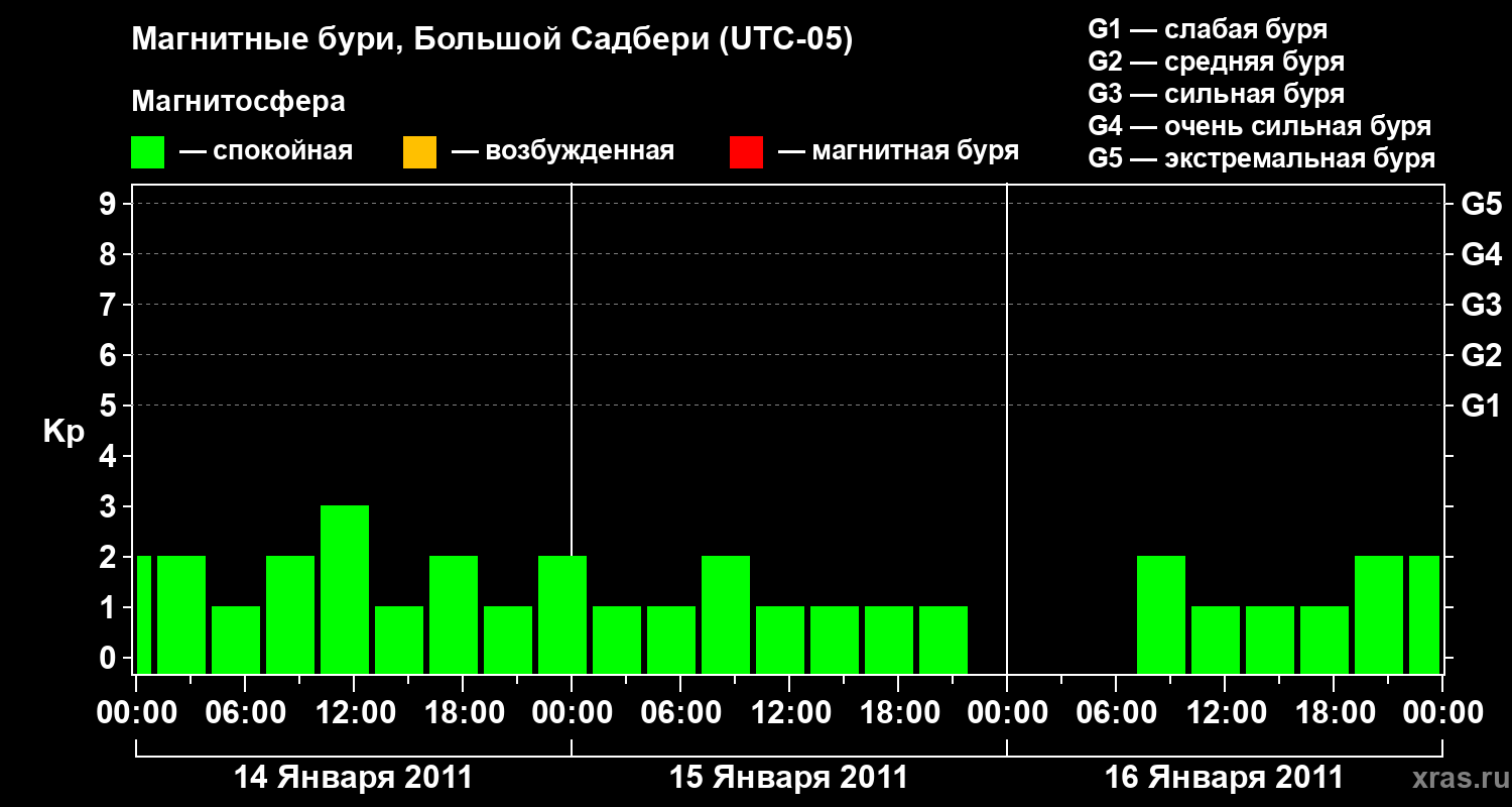 Изменения геомагнитного индекса Kp с 14 по 16 января 2011 года для средних широт