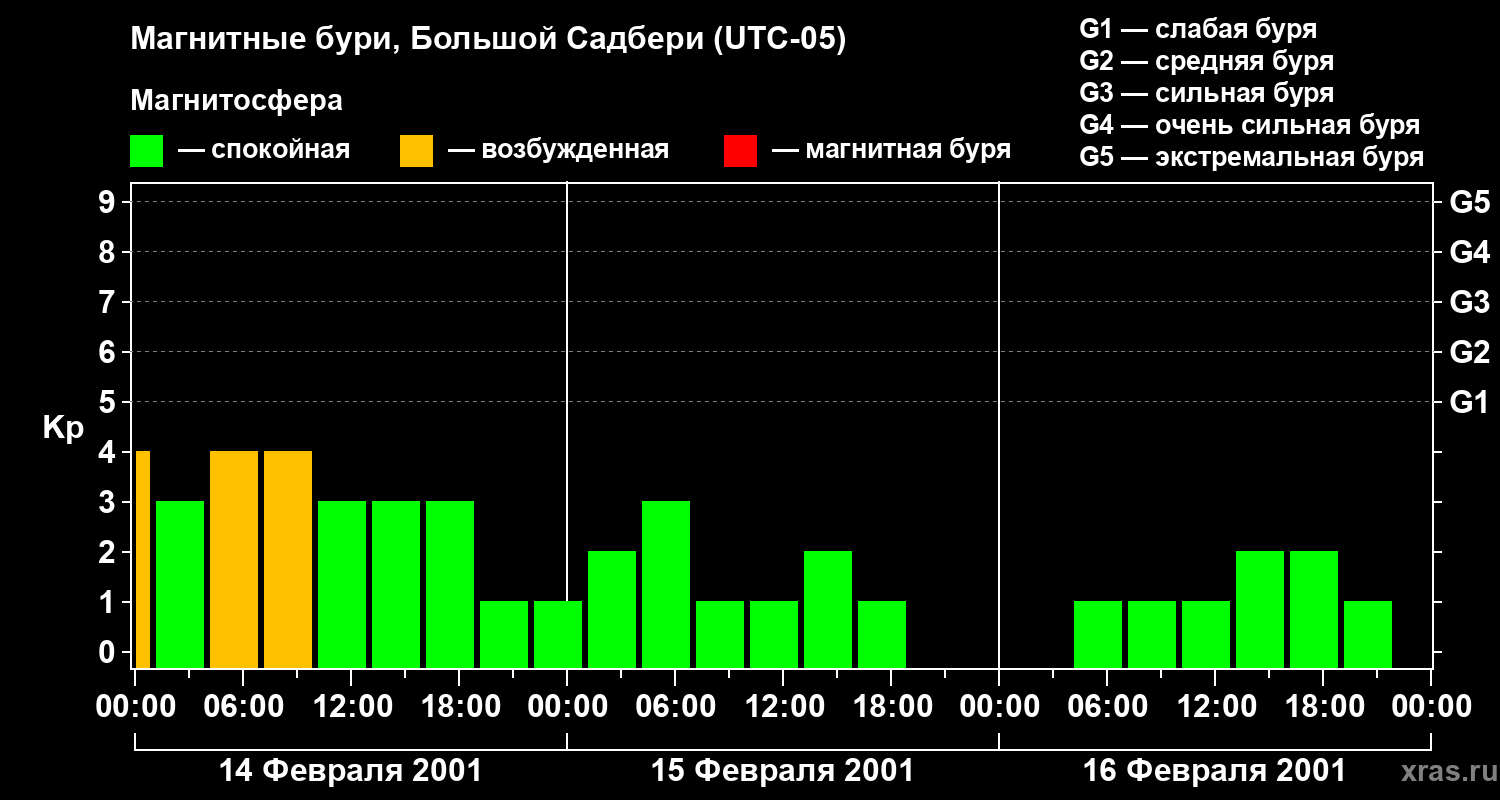 Изменения геомагнитного индекса Kp с 14 по 16 февраля 2001 года для средних широт