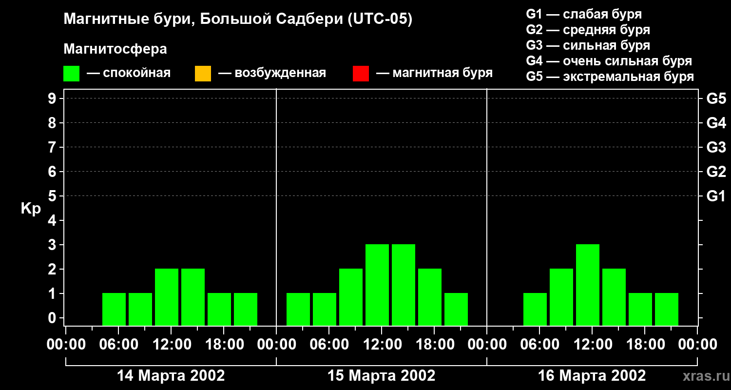 Изменения геомагнитного индекса Kp с 14 по 16 марта 2002 года для средних широт