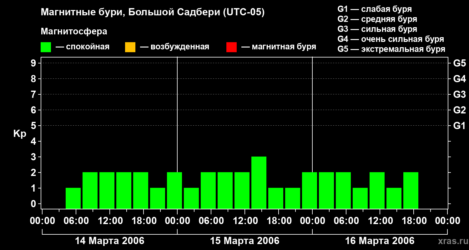 Изменения геомагнитного индекса Kp с 14 по 16 марта 2006 года для средних широт