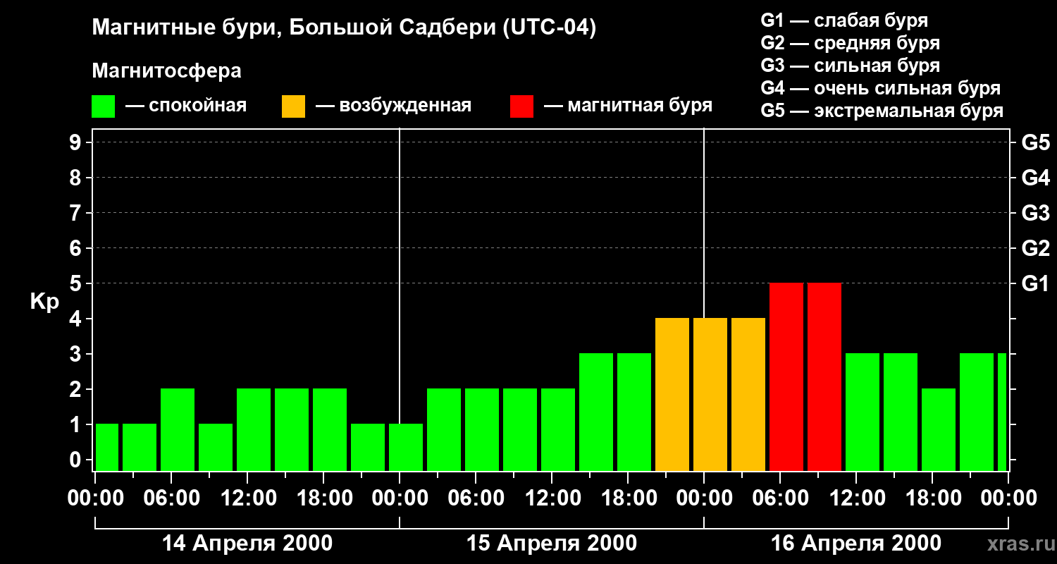 Изменения геомагнитного индекса Kp с 14 по 16 апреля 2000 года для средних широт