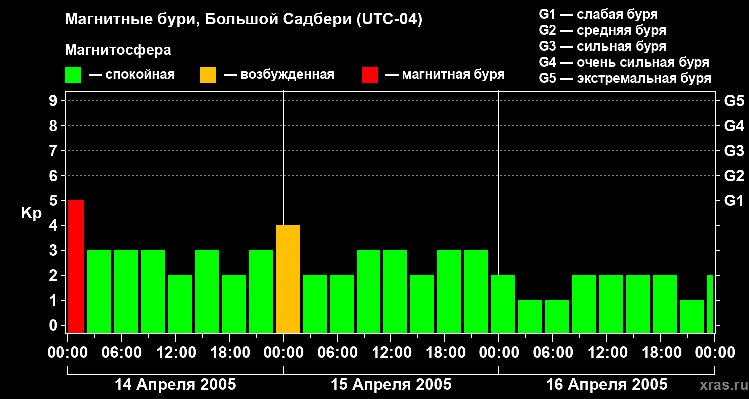 Изменения геомагнитного индекса Kp с 14 по 16 апреля 2005 года для средних широт