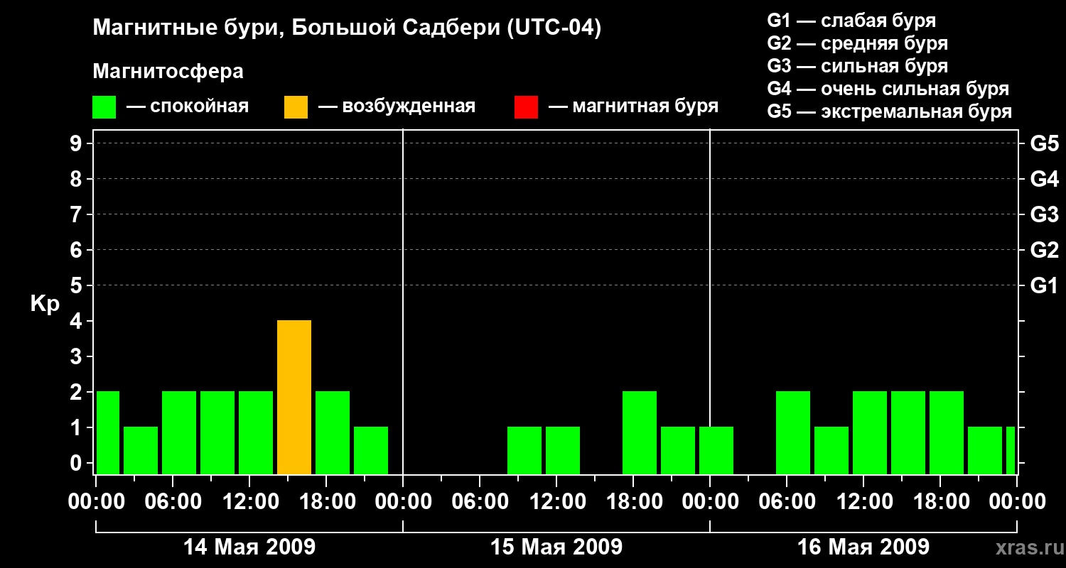 Изменения геомагнитного индекса Kp с 14 по 16 мая 2009 года для средних широт