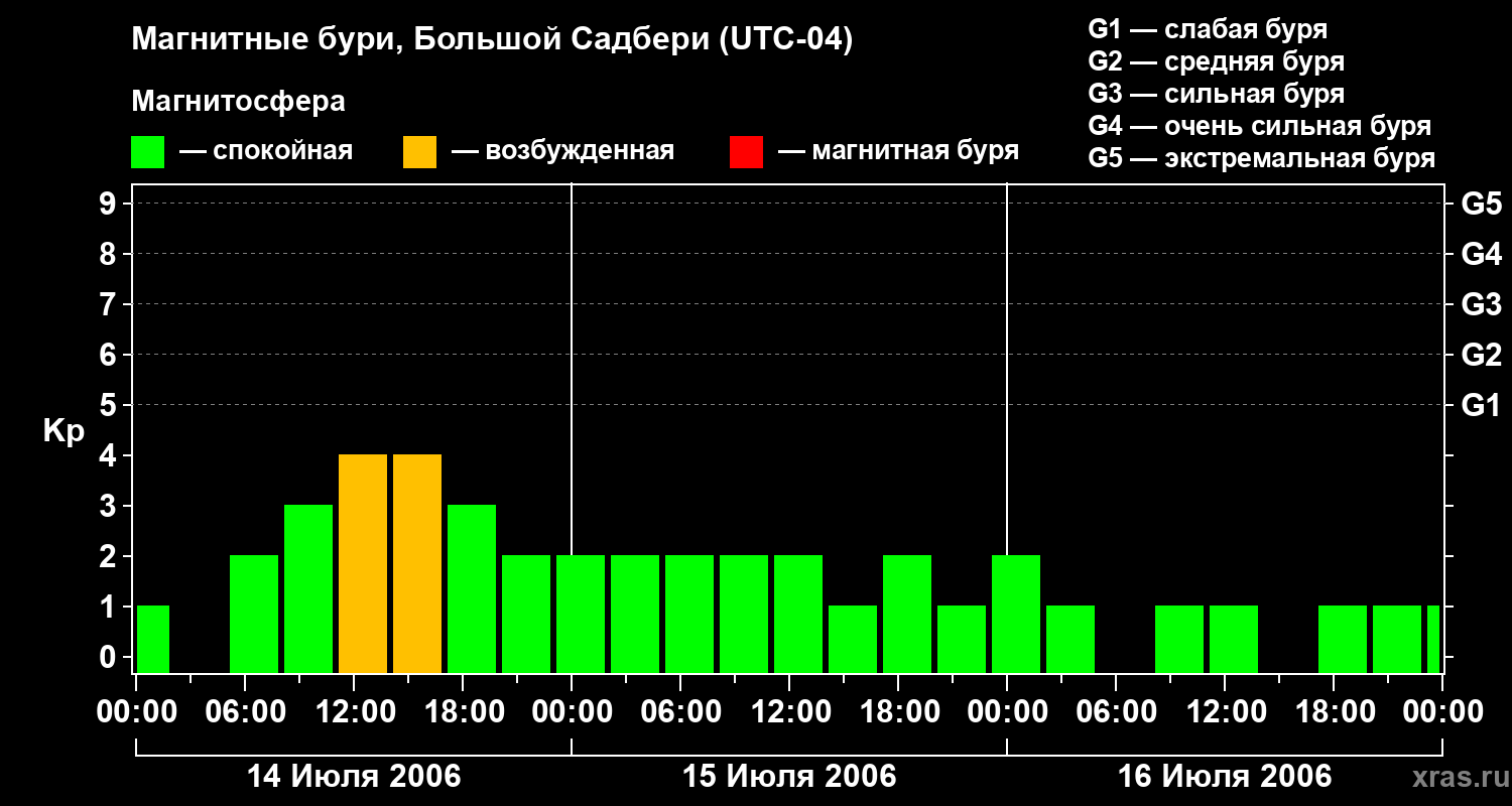 Изменения геомагнитного индекса Kp с 14 по 16 июля 2006 года для средних широт