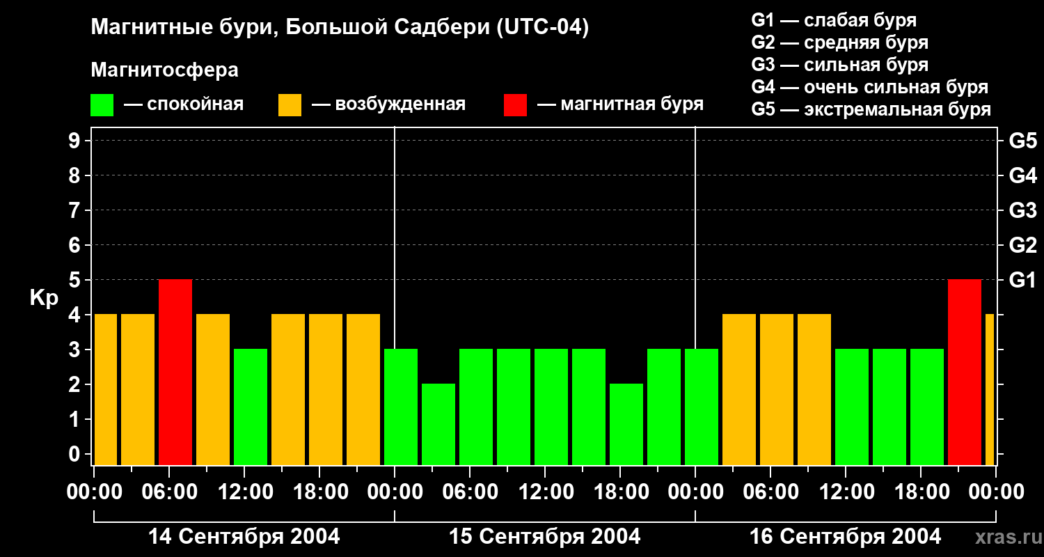 Изменения геомагнитного индекса Kp с 14 по 16 сентября 2004 года для средних широт