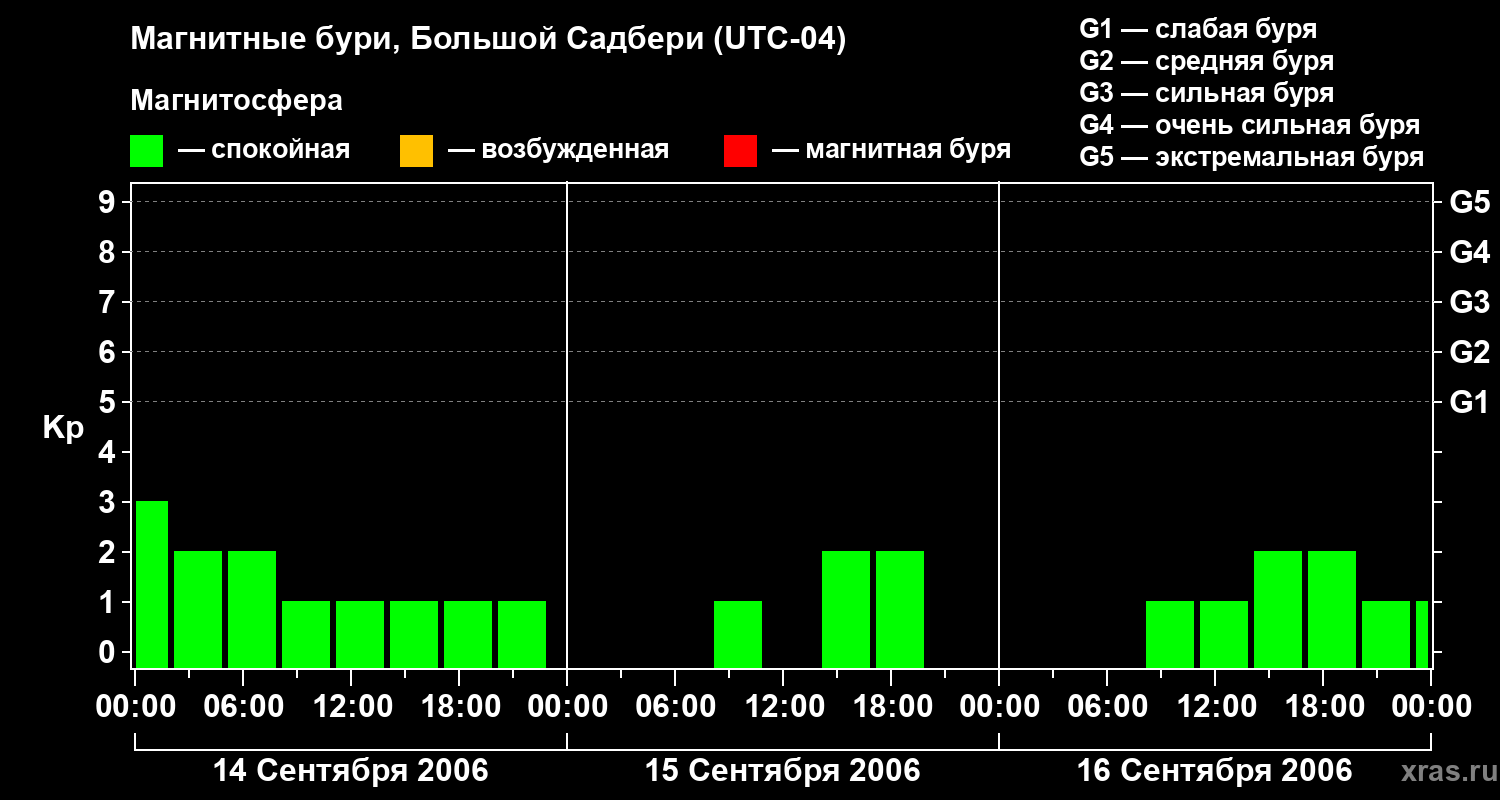 Изменения геомагнитного индекса Kp с 14 по 16 сентября 2006 года для средних широт