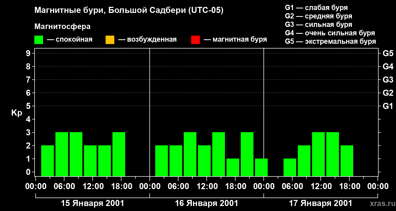 Изменения геомагнитного индекса Kp с 15 по 17 января 2001 года для средних широт