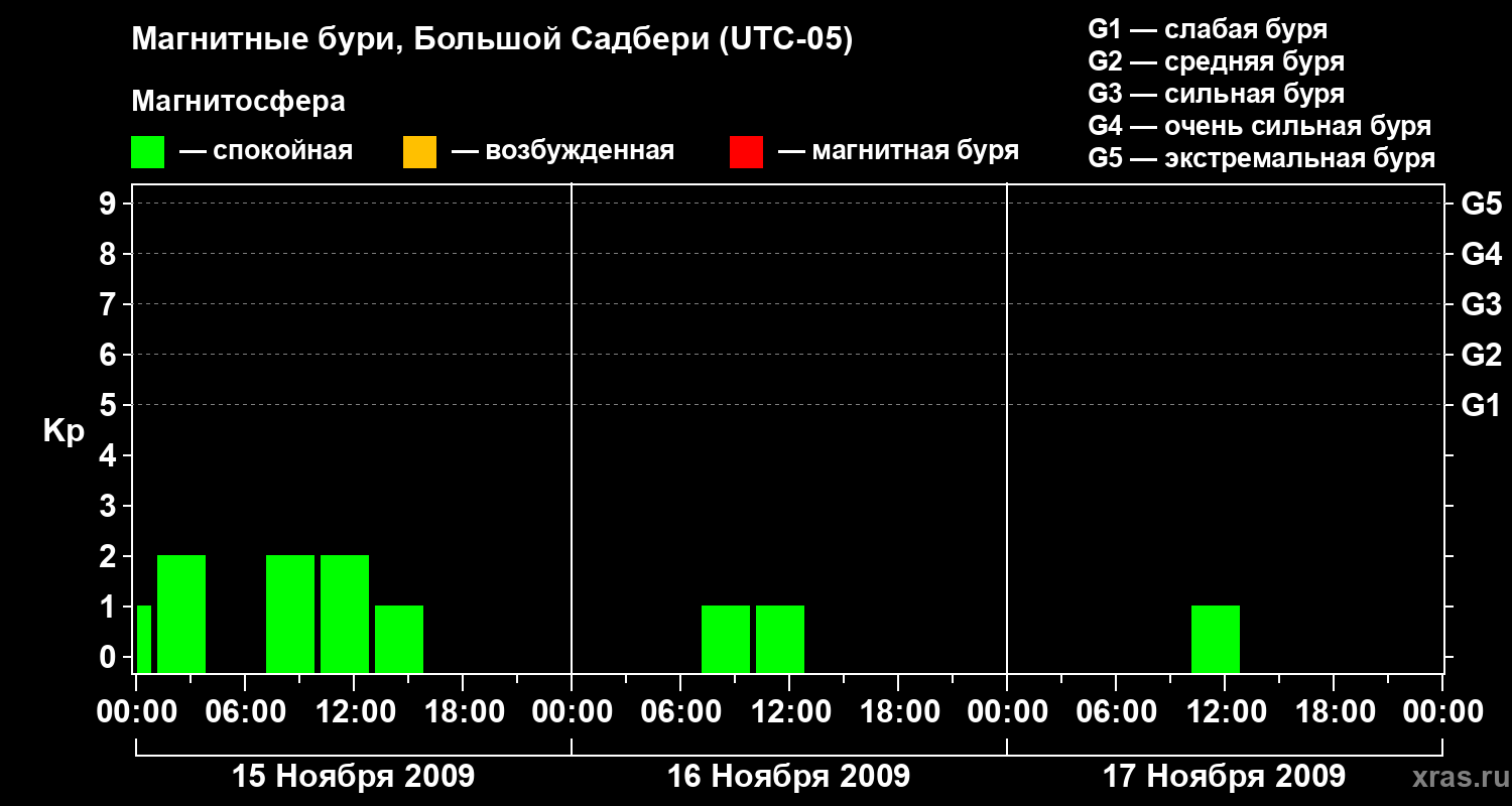 Изменения геомагнитного индекса Kp с 15 по 17 ноября 2009 года для средних широт