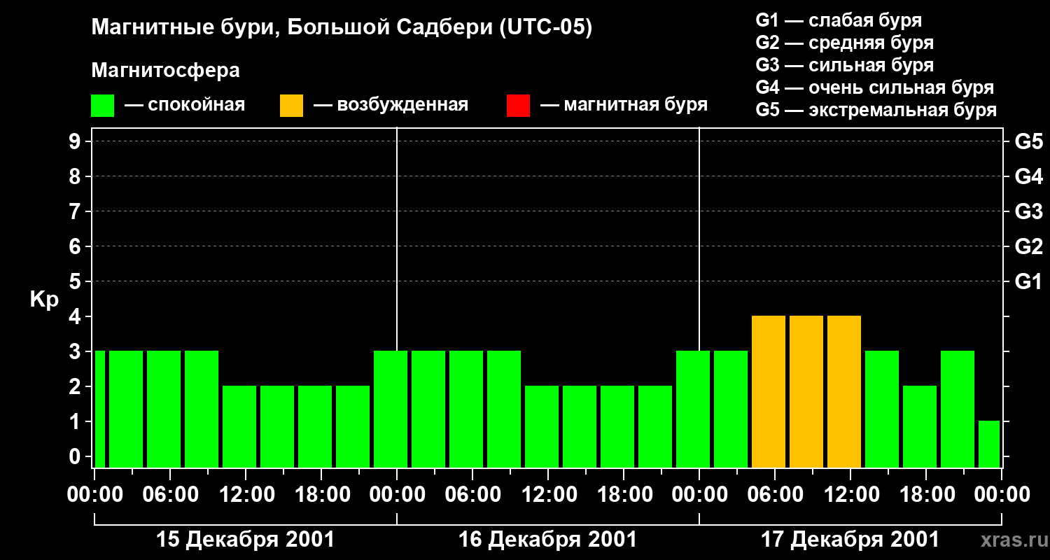 Изменения геомагнитного индекса Kp с 15 по 17 декабря 2001 года для средних широт