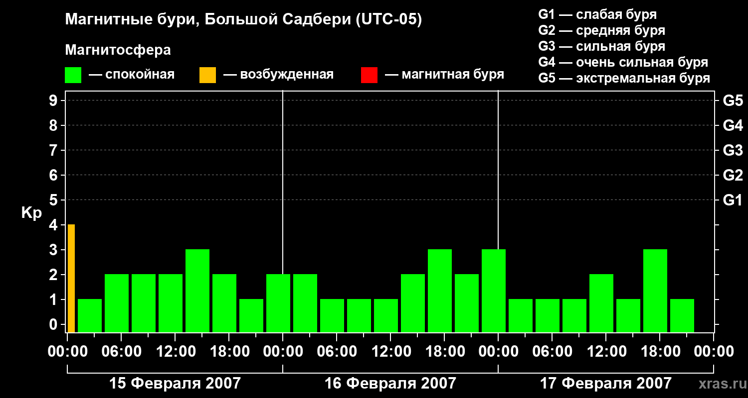 Изменения геомагнитного индекса Kp с 15 по 17 февраля 2007 года для средних широт