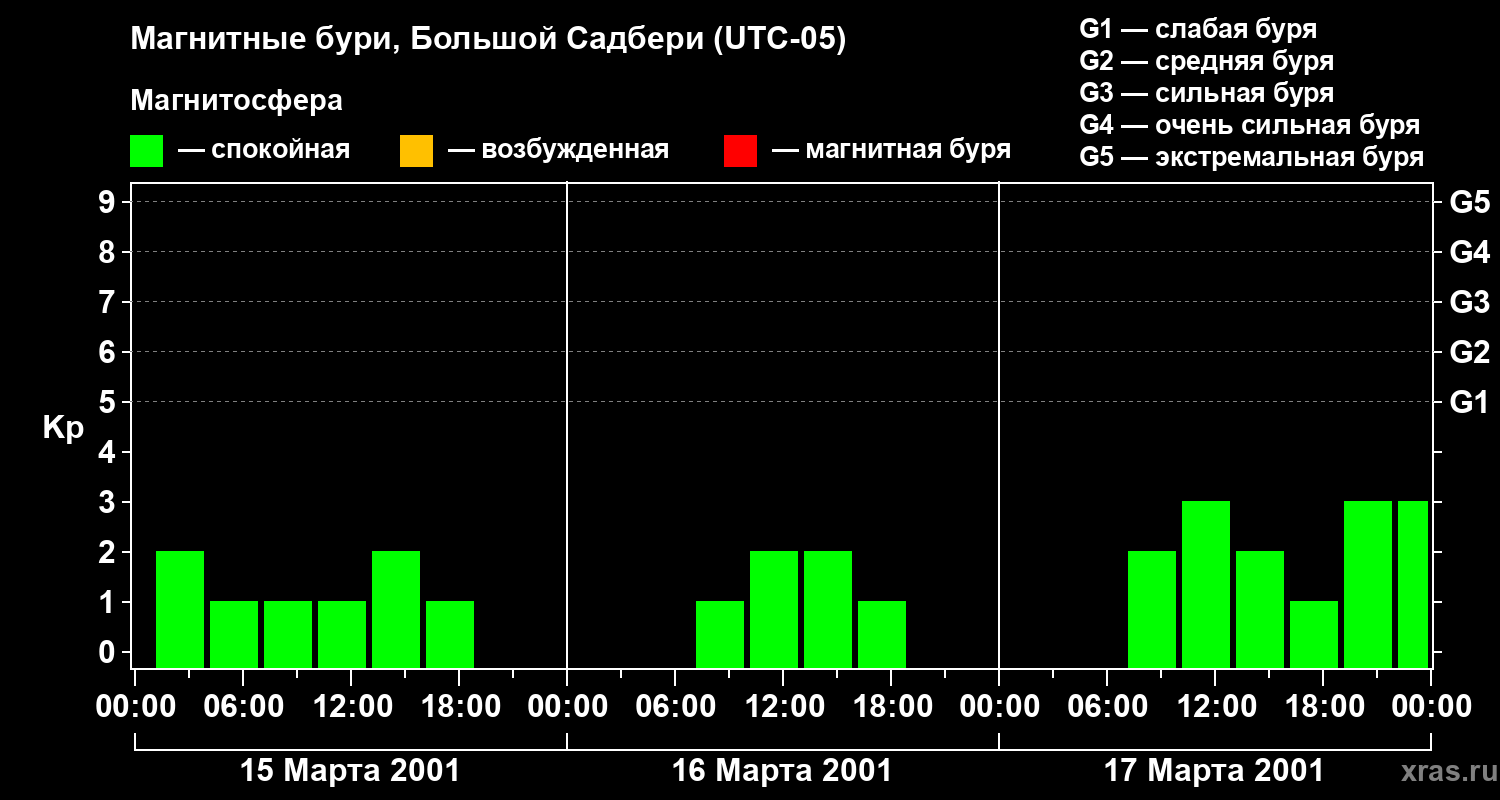 Изменения геомагнитного индекса Kp с 15 по 17 марта 2001 года для средних широт