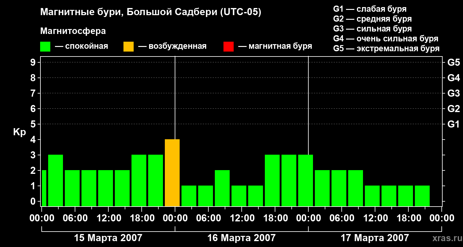 Изменения геомагнитного индекса Kp с 15 по 17 марта 2007 года для средних широт