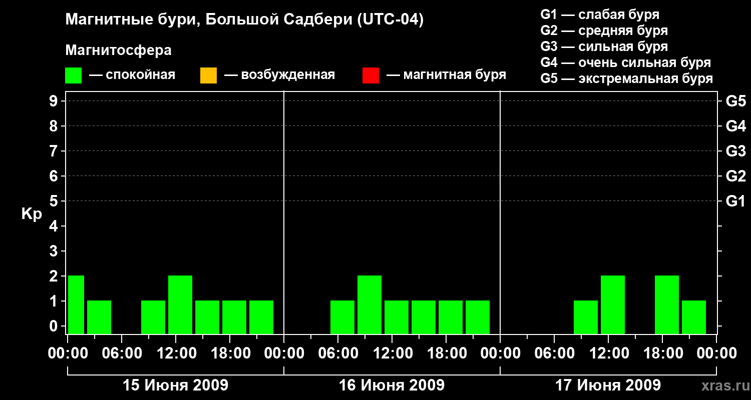 Изменения геомагнитного индекса Kp с 15 по 17 июня 2009 года для средних широт