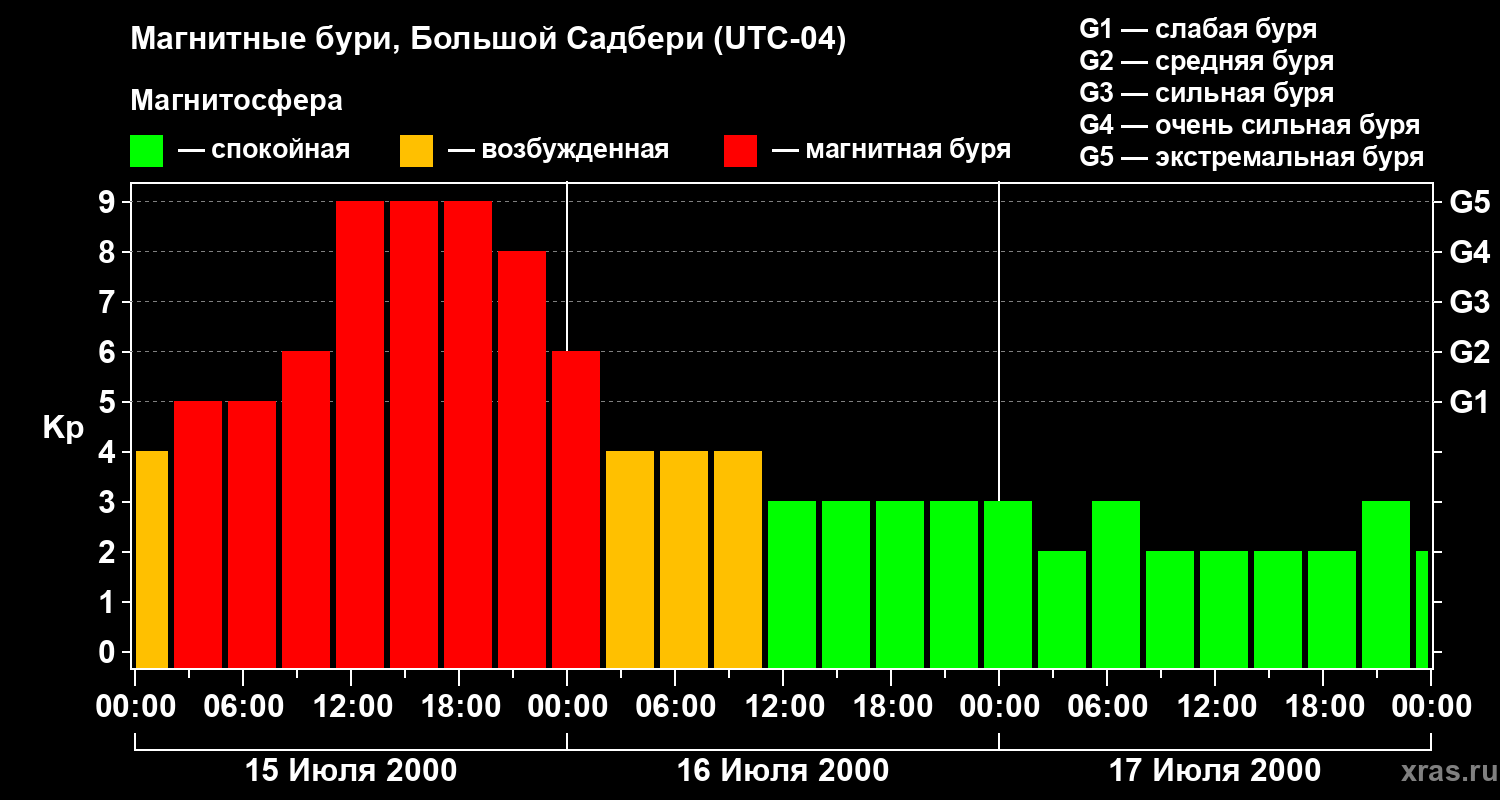 Изменения геомагнитного индекса Kp с 15 по 17 июля 2000 года для средних широт