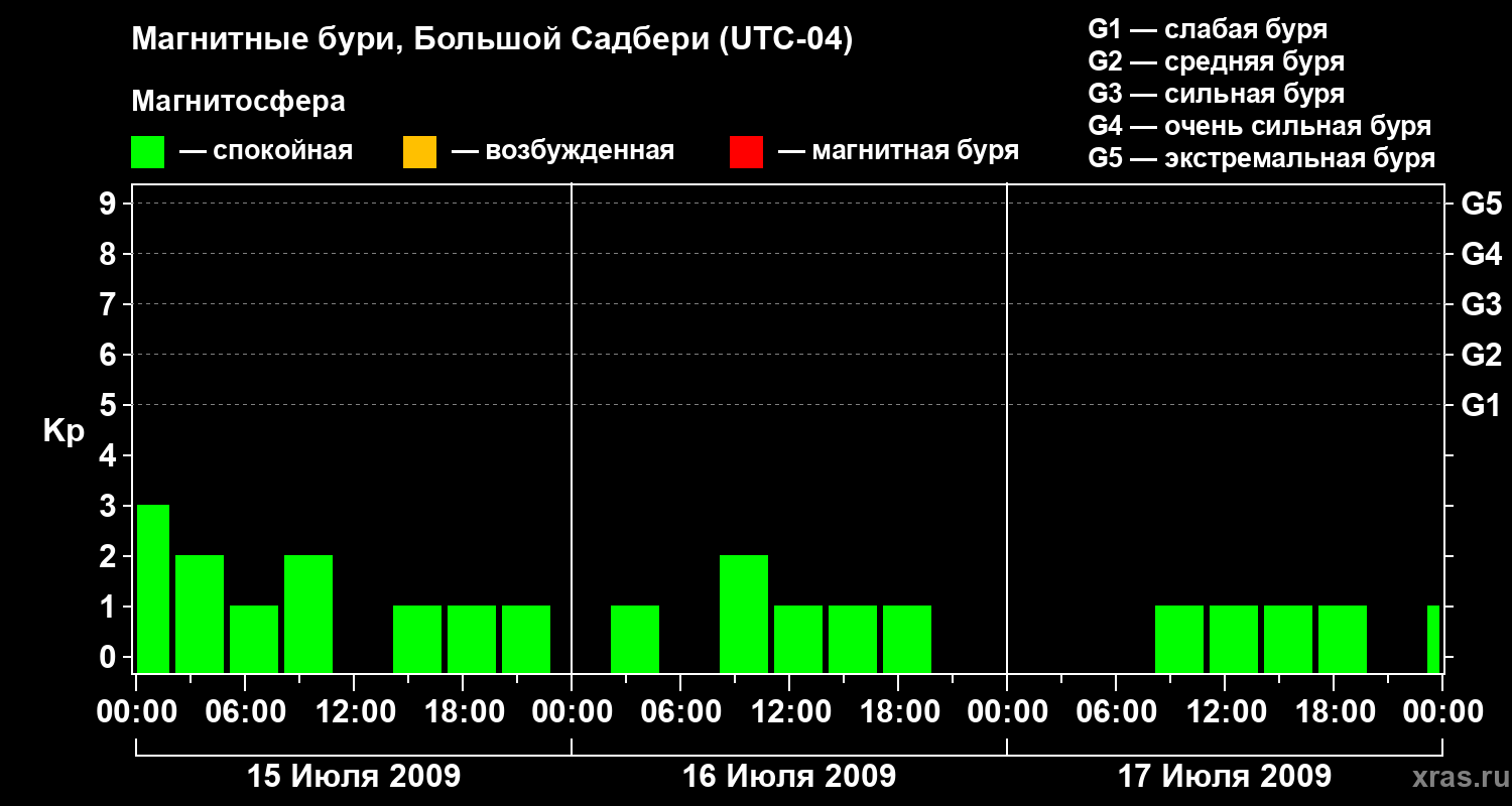 Изменения геомагнитного индекса Kp с 15 по 17 июля 2009 года для средних широт