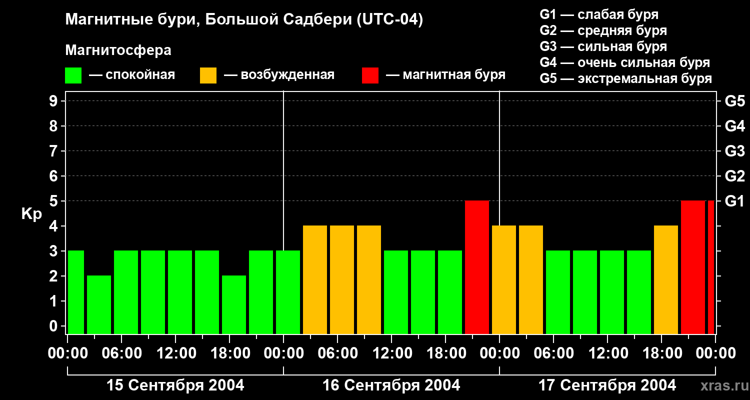 Изменения геомагнитного индекса Kp с 15 по 17 сентября 2004 года для средних широт
