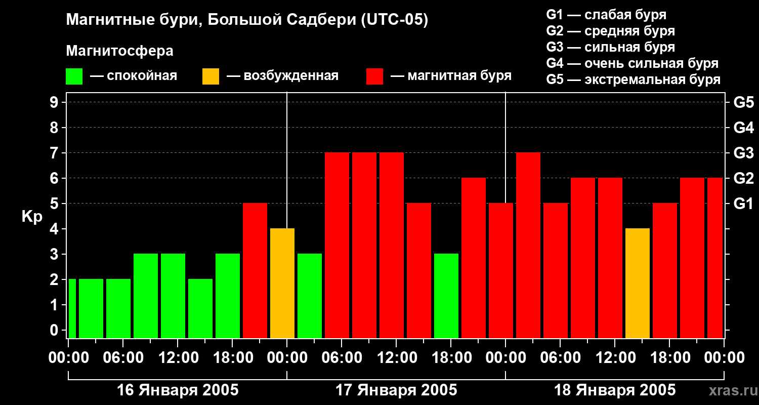 Изменения геомагнитного индекса Kp с 16 по 18 января 2005 года для средних широт
