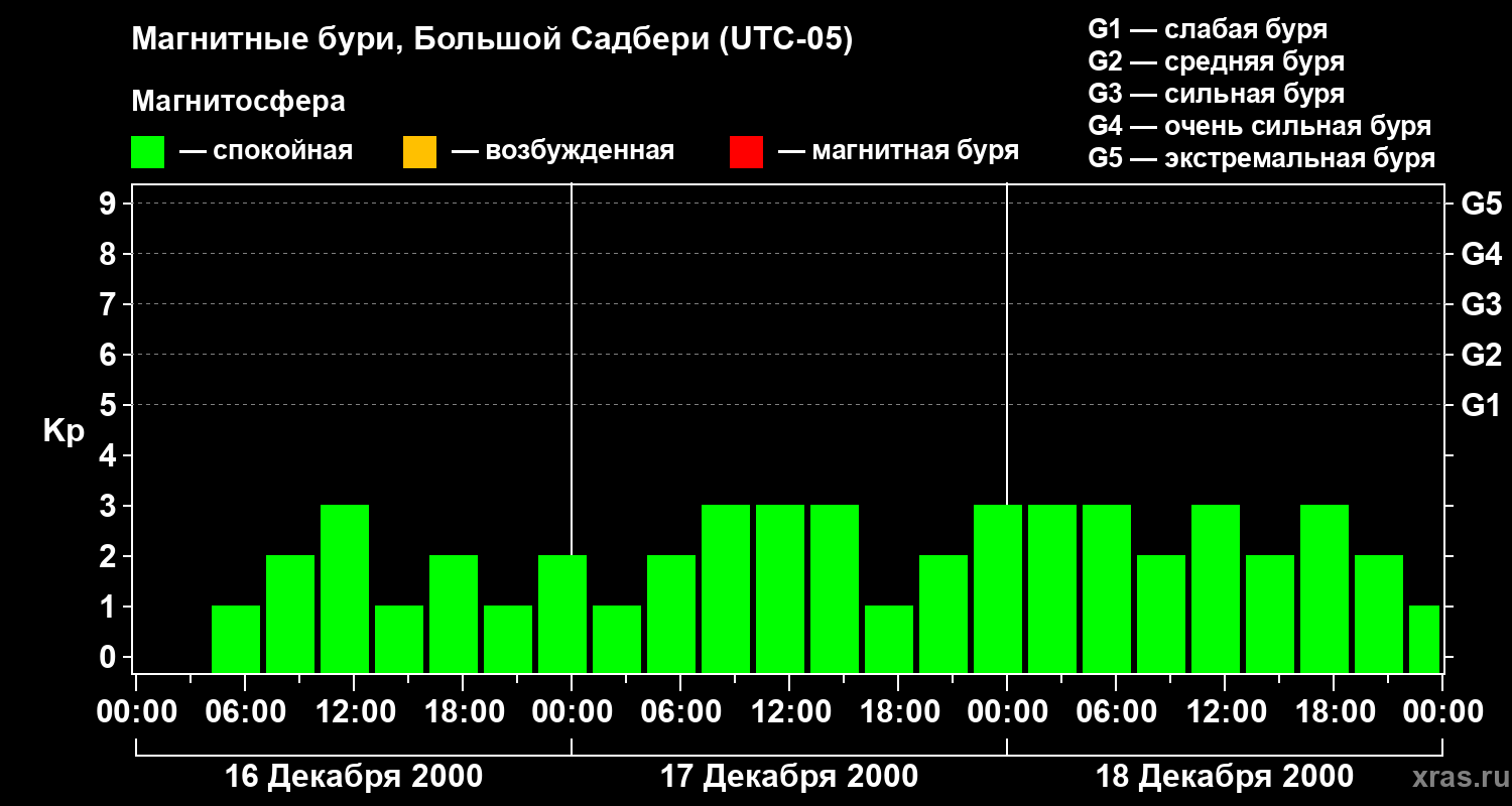 Изменения геомагнитного индекса Kp с 16 по 18 декабря 2000 года для средних широт