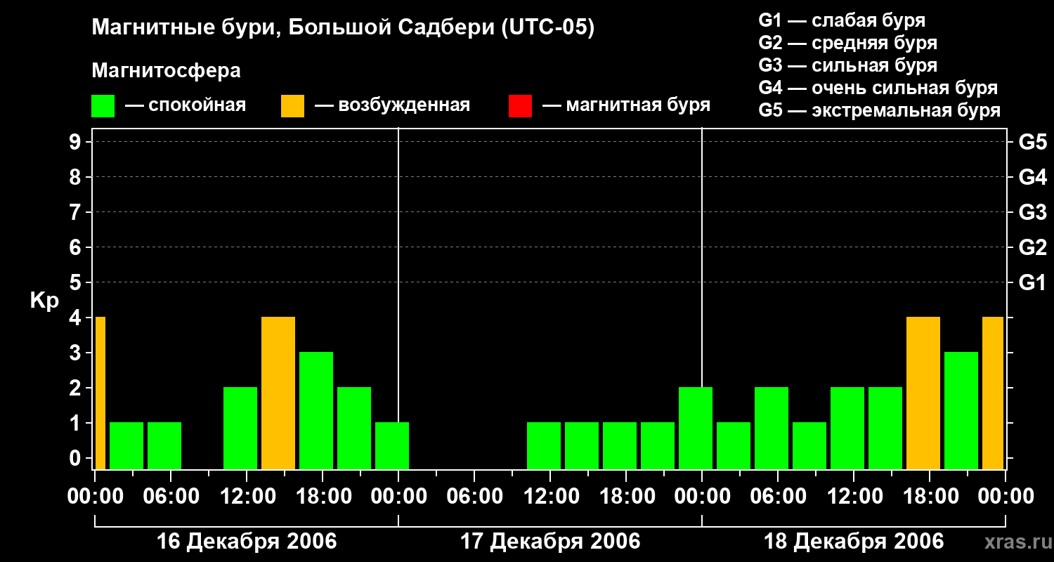 Изменения геомагнитного индекса Kp с 16 по 18 декабря 2006 года для средних широт