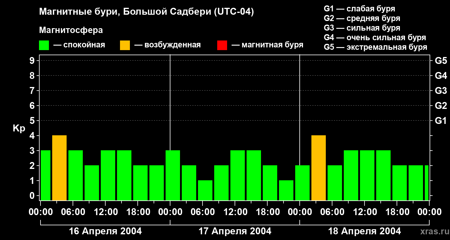 Изменения геомагнитного индекса Kp с 16 по 18 апреля 2004 года для средних широт