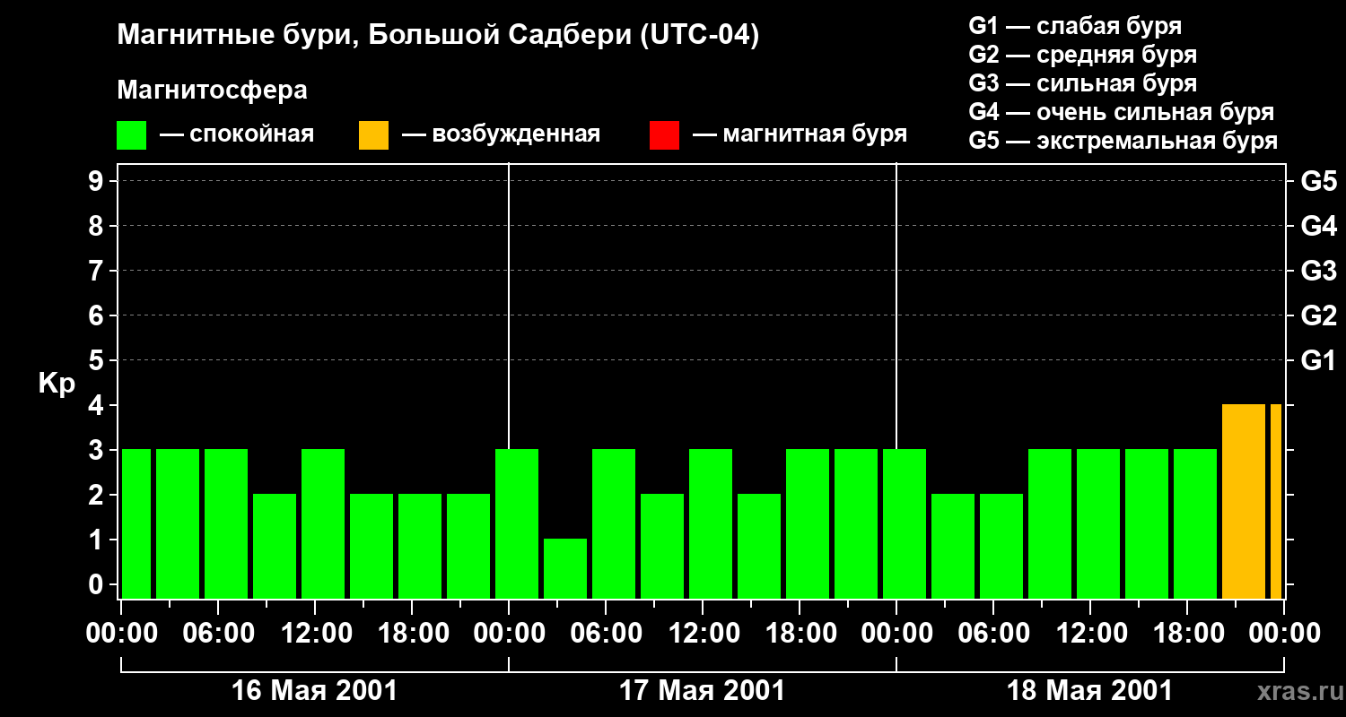 Изменения геомагнитного индекса Kp с 16 по 18 мая 2001 года для средних широт