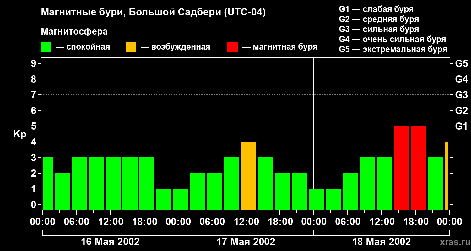 Изменения геомагнитного индекса Kp с 16 по 18 мая 2002 года для средних широт