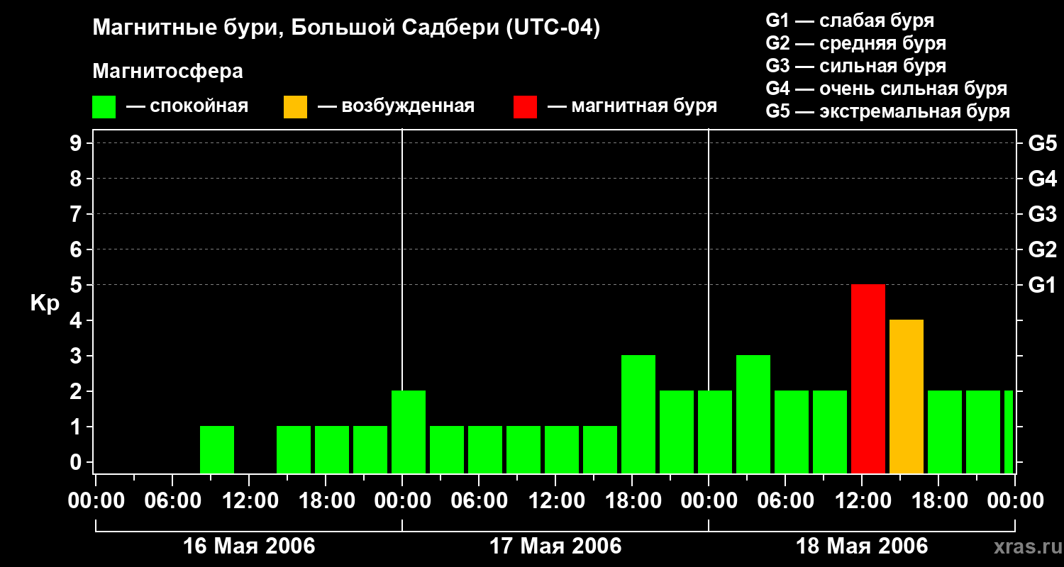 Изменения геомагнитного индекса Kp с 16 по 18 мая 2006 года для средних широт