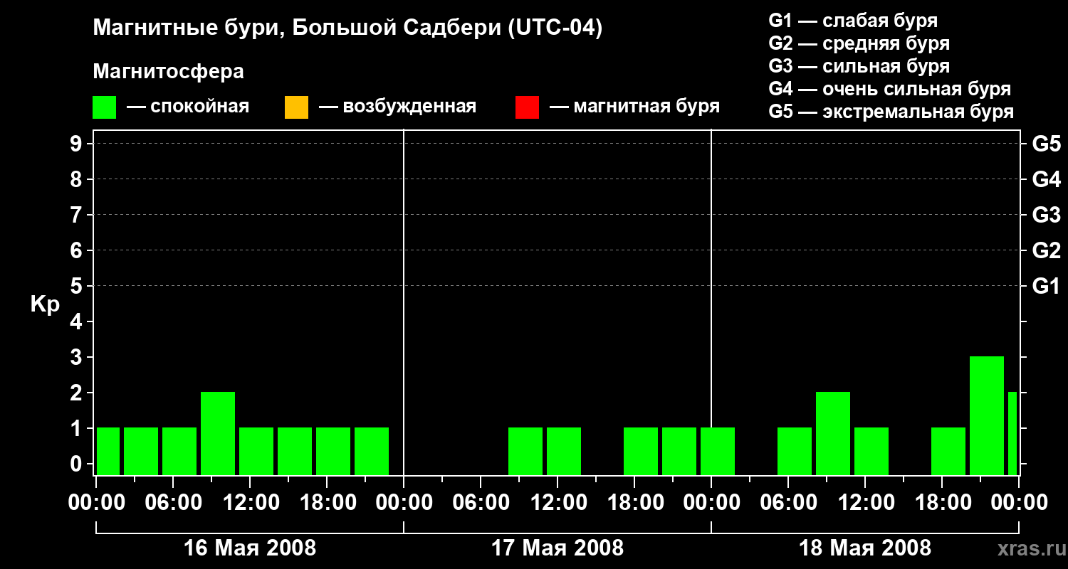 Изменения геомагнитного индекса Kp с 16 по 18 мая 2008 года для средних широт