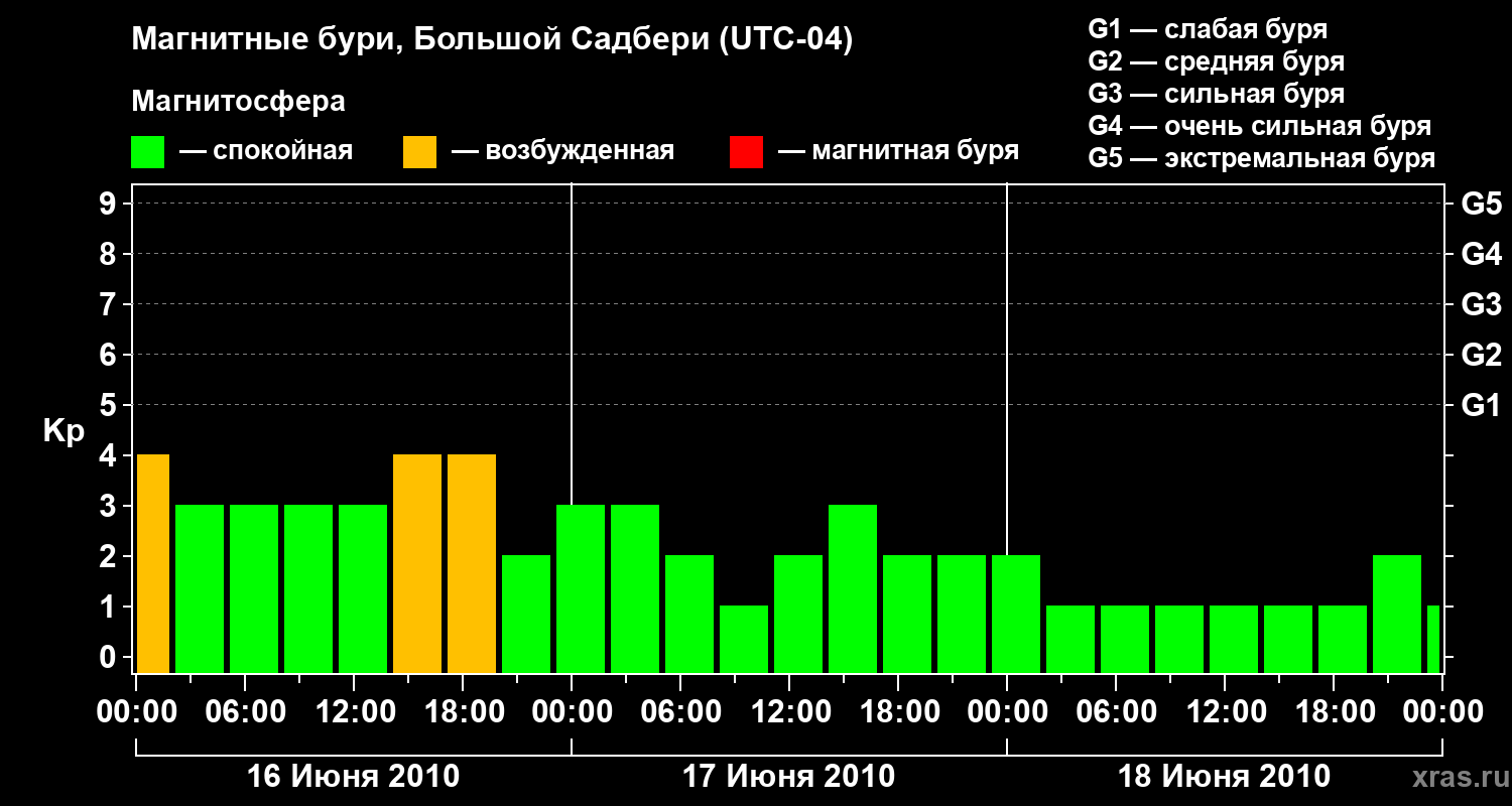 Изменения геомагнитного индекса Kp с 16 по 18 июня 2010 года для средних широт