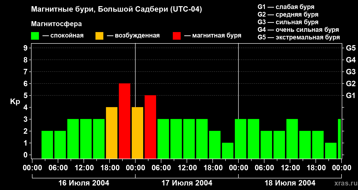 Изменения геомагнитного индекса Kp с 16 по 18 июля 2004 года для средних широт