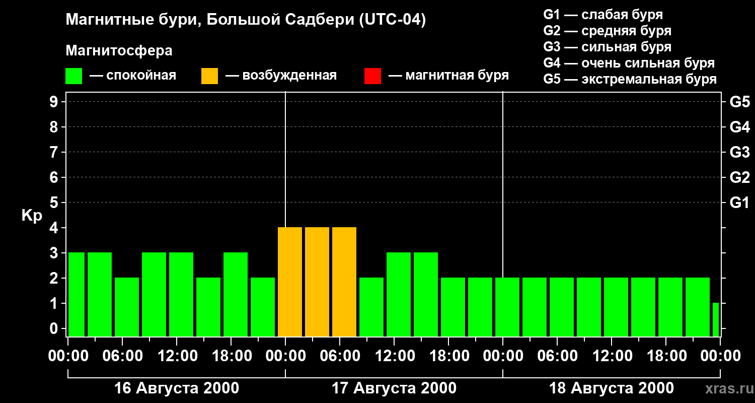 Изменения геомагнитного индекса Kp с 16 по 18 августа 2000 года для средних широт