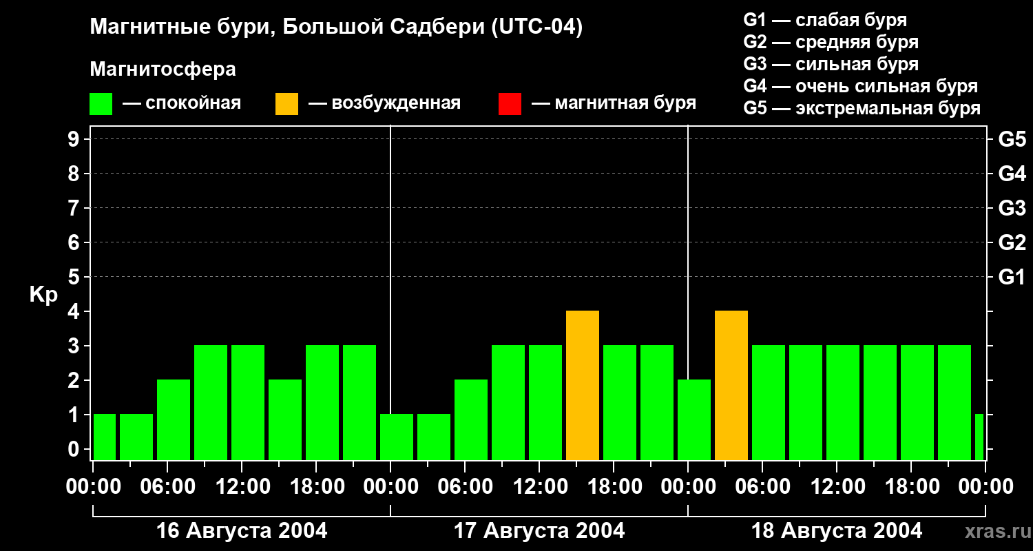 Изменения геомагнитного индекса Kp с 16 по 18 августа 2004 года для средних широт