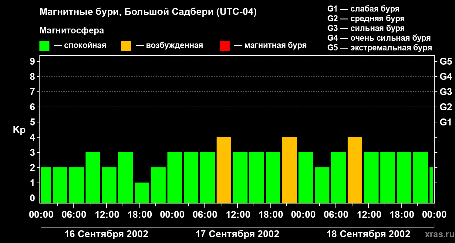 Изменения геомагнитного индекса Kp с 16 по 18 сентября 2002 года для средних широт